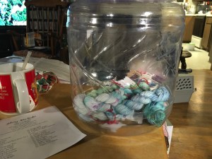 I’ve also cleaned out a plastic tub and I’m using it to keep my mini-skeins. I think it’ll work. I like being able to see the skeins. They’re pretty and I just want to stare at them. I love having color around me.