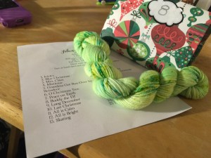 Buddy the Elf. This is the name of today’s yarn. It is another bright green speckle. I’m impressed at the sheer variety of shades and speckles. Each skein has been as beautiful as the first day. Into the great Tub O’ Yarn it goes. My pile is growing.