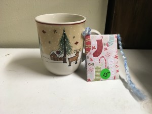 Today’s cup was given to me as a Secret Santa gift when I was in Grad School. (We do not need to say how many years ago that was.) It had a coffee scented candle in it. When the candle was used up, I cleaned it out and started using it for actual coffee. It is such a sweet winter scene on it that every year I think I should leave it out and use it throughout winter. But then I decide to just pack it up and save it for next year.